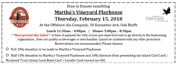 Come to Offshore Ale in Oak Bluffs for a Dine to Donate event benefiting Martha’s Vineyard Playhouse!